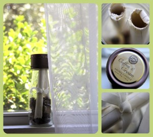 My first project was one that kind of hit me out of nowhere. I was walking past a table in our house and an empty Starbucks Frappuccino bottle was sitting there. I immediately wanted to do something creative with it. I took it and began to brainstorm. I found a few things we had lying around the house, some potpourri, a few stones and a few old coins. For the papers inside, I coffee stained them and then decided to write out encouraging words I’ve received from people through the years. I went through some old journals, emails, etc. and wrote them down. Last, I found an old coffee & cream candle lying around that fit perfectly on top, without crushing the papers. I was oddly satisfied with the final product. It’s something I will keep for many years and look back on the encouraging/loving words people have spoken to me. This little glass bottle contains words of life and a reminder of where I’ve been & where I am going.