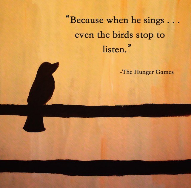 So today, after hours and hours of painting, I decided to combine two things in one. These paintings and my mad skills (they’re not all that mad, but they’re decent) of photoshop. This creation was inspired by one of my new favorite things, The Hunger Games. There’s a quote in the book that just immediately stole my heart as soon as I read it. Although it’s about the main characters dad, it makes me think of God. It makes me think of his majesty and beauty. It makes me think of how creation is often rampaged by his glory and beauty.